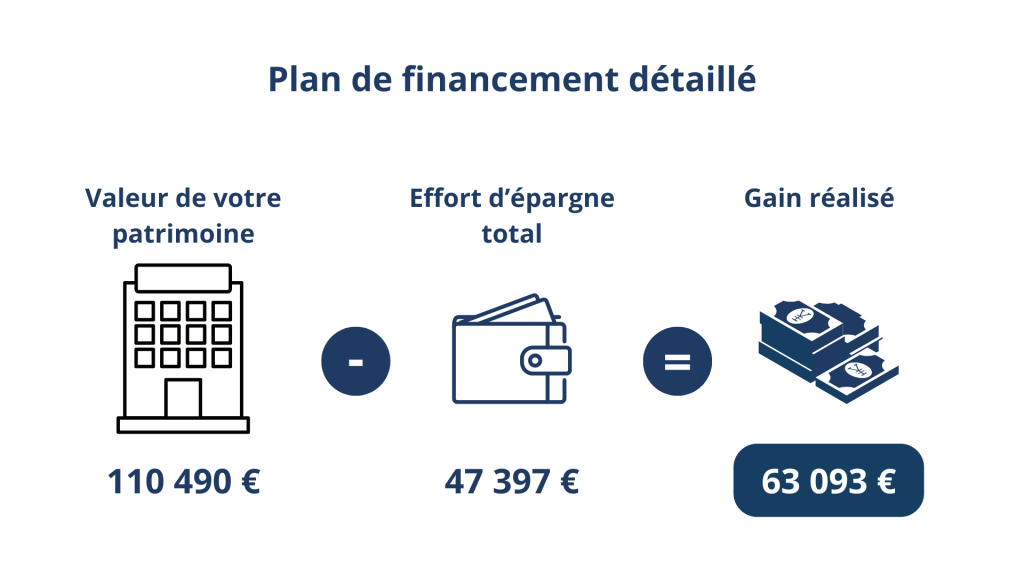 ↳ Prenons l’exemple ci-dessus : pour un emprunt de 100 000 € sur 20 ans au taux de 3,3 %, les loyers encaissés couvrent environ 57 % du financement. L’investisseur ne mobilise donc que 197 € par mois de son épargne personnelle, alors que son patrimoine atteint 110 490 € à l’échéance, soit un gain net de plus de 63 000 €. C’est tout l’intérêt de l’effet de levier du crédit.