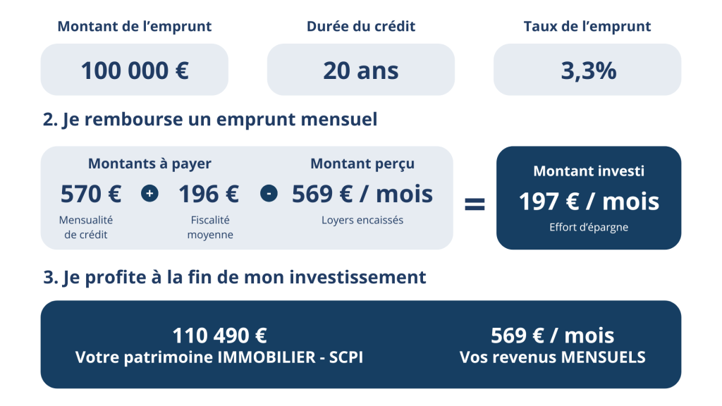 L’un des plus grands atouts de la SCPI réside dans la possibilité d’y investir à crédit. Concrètement, les loyers générés par la SCPI viennent couvrir une grande partie des mensualités de remboursement. On parle alors de mécanique des flux : ce sont les locataires des biens détenus par la SCPI qui, en payant leurs loyers, participent directement au remboursement du crédit contracté par l’investisseur.